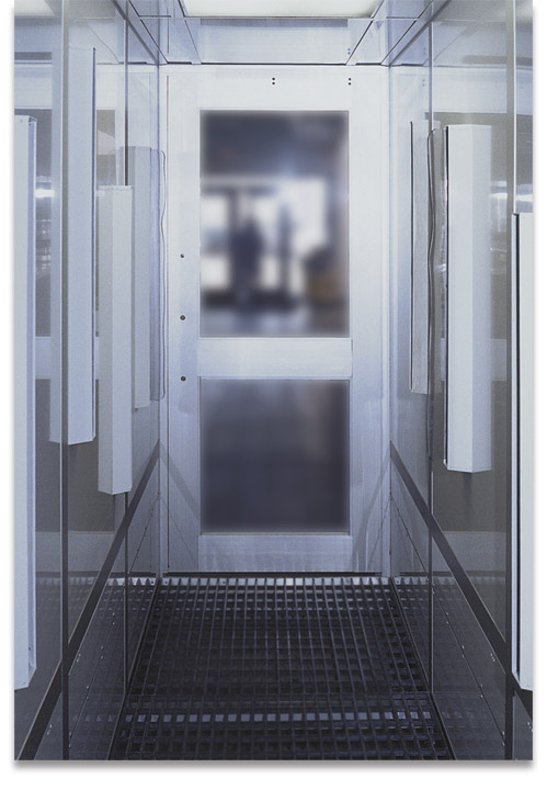 Optional (but highly recommended) door forms seal between air shower and outside environment. Studies show that a door slows down an employee's pace resulting in greater hair and loose particle removal.